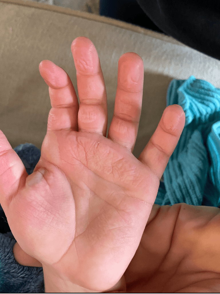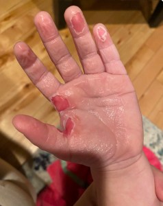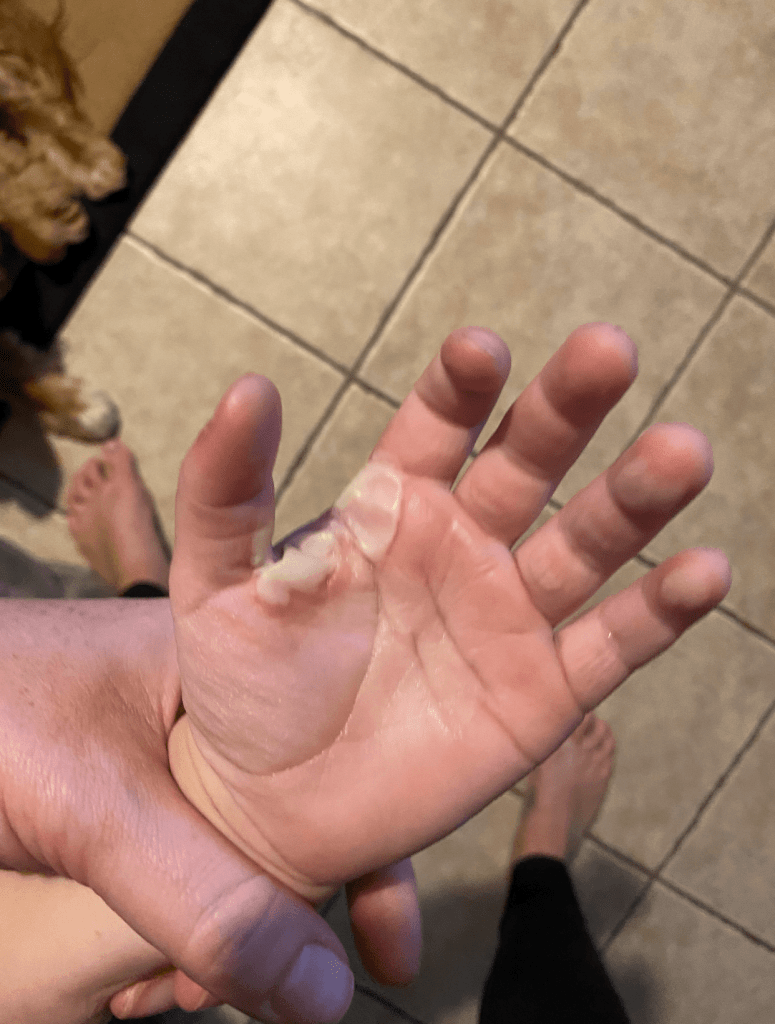 A lot of burns blister. It’s the natural process that occurs when the superficial damaged skin separates from the skin underneath. There are varying opinions on whether to pop blisters or not. I generally recommend leaving intact blisters alone unless they’re large and are putting pressure on the area. What Christine found herself faced with were several blisters on Jack’s hand that ruptured on their own. Ruptured blisters should be debrided (a fancy term for clipping away the dead skin that used to be a blister) to help minimize chances of infection (Tenenhaus & Rennekampff, 2019). This can be done with a nail clippers or small scissors that have been cleaned with rubbing alcohol or boiled to sterilize prior to use. This sounds scarier than it is: it usually doesn’t hurt because the skin being removed is already dead. Jack’s mom took on the task and did a fantastic job and her skills can be seen above here, leaving fresh, healing skin behind: